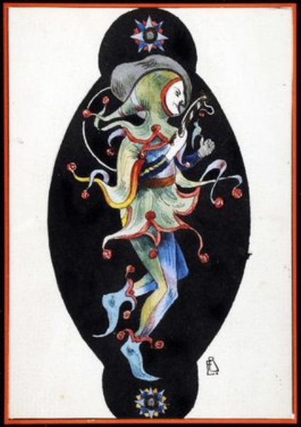 stylised figure of a jester on a black cartouche