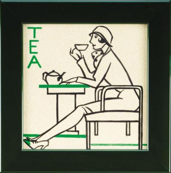 | Painting with a stylised young woman sipping tea, in later green lacquered wood frame | |