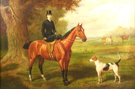 A HUNTSWOMAN SITTING SIDESADDLE BY A HOUND, THE HUNT IN THE DISTANCE