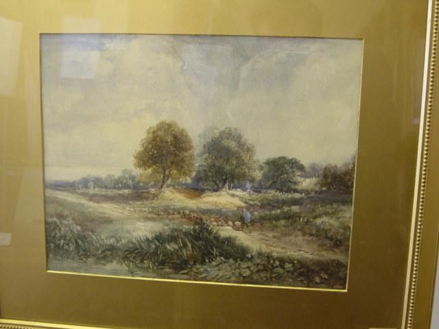 | A SHEPHERD HERDING SHEEP BY A POOL IN A COUNTRY LANDSCAPE | |