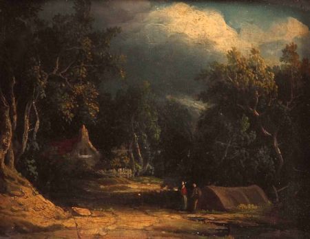 | Wooded Landscape with Figures by an Encampment, Village Beyond | |