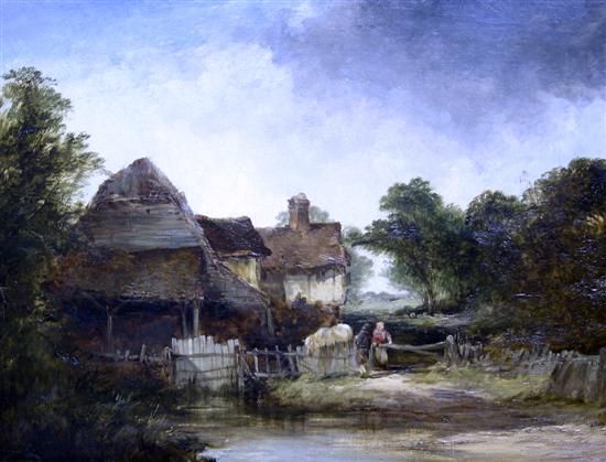 Figures beside a farmhouse