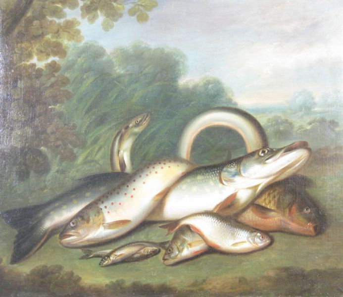 A Still Life of brown Trout, Pike, Perch and an Eel on a Bank