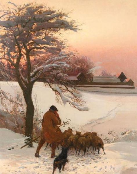 | A shepherd and his flock in a winter landscape, with a farm in the background | |