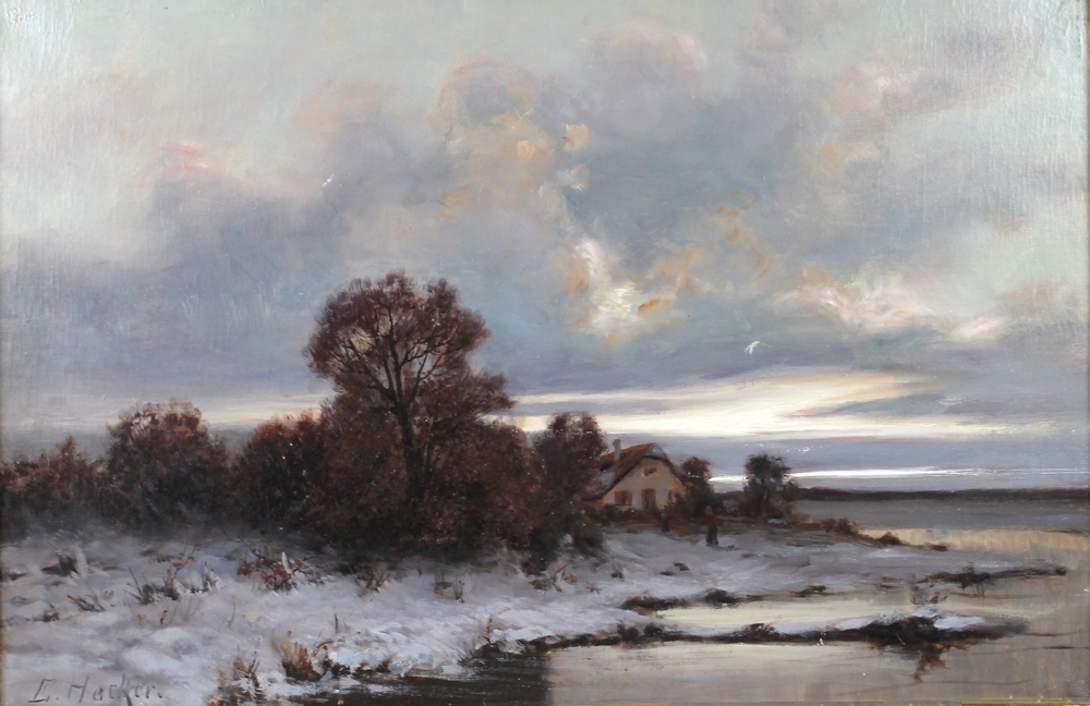 | a frozen evening landscape, with a cottage and sun set | |