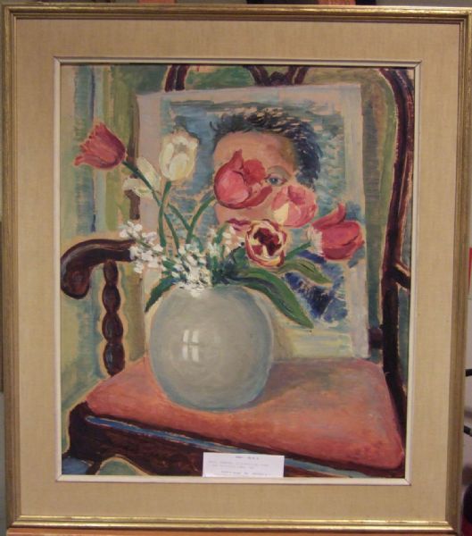 Stilleben med blommor och porträtt