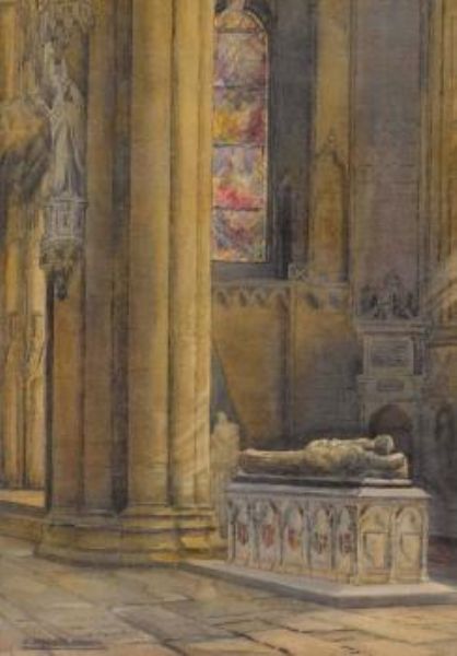 Inneres einer gotischen Kirche mit einem Grabmal.