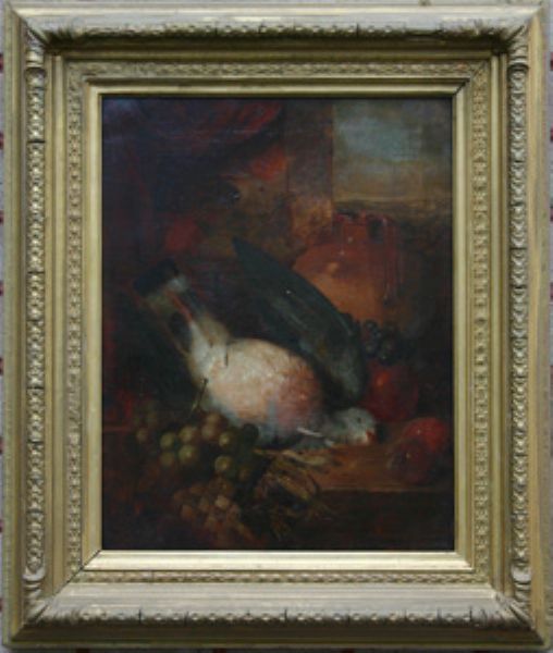 Stilleben, krus, duva och vindruvor,