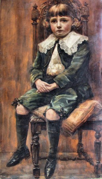 | Full length portrait of a young boy wearing a green jacket and breeches seated on a chair | |