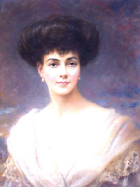 Portrait of a lady, quarter-length in a white dress with a landscape beyond