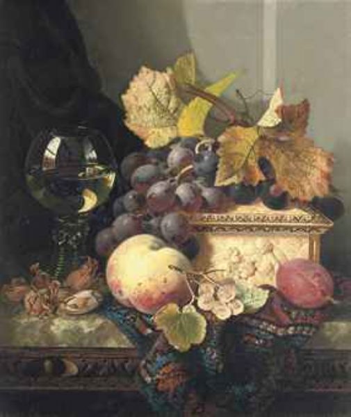 | Black grapes, a peach, a plum, white currants, hazelnuts, a roemer and an ivory casket on a carpet on a marble ledge | |