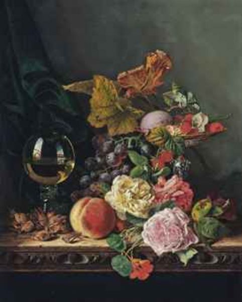 | Cobnuts, a roemer, a peach, roses, nasturtiums, raspberries, a speckled egg, black grapes, white currants, and a tazza, on a car | |