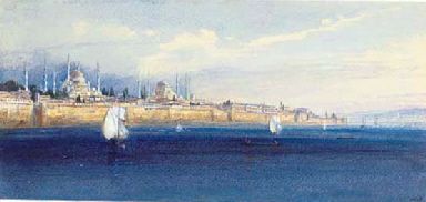 | Constantinople from the sea of Marmara, with the Mosque of Sultan Ahmet and Hagia Sophia | |