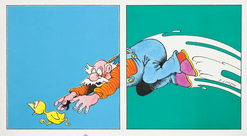 | Illustration for Wanda Chotomska's book "Kurcze blade", page 14 and 15 | |