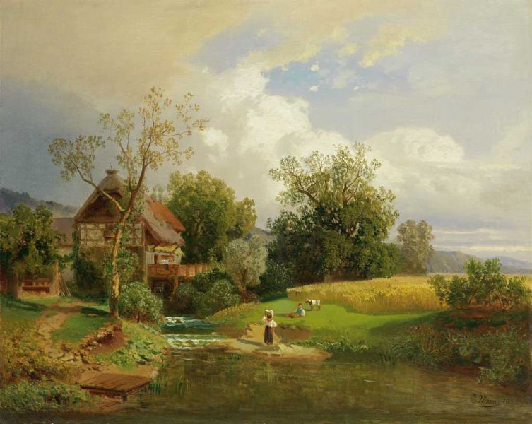 Sommerliche Erntelandschaft mit Figurenstaffage und alter Mühle