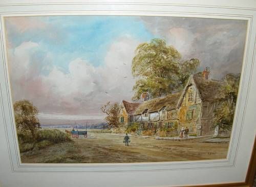 Figures on a country lane before a cottage