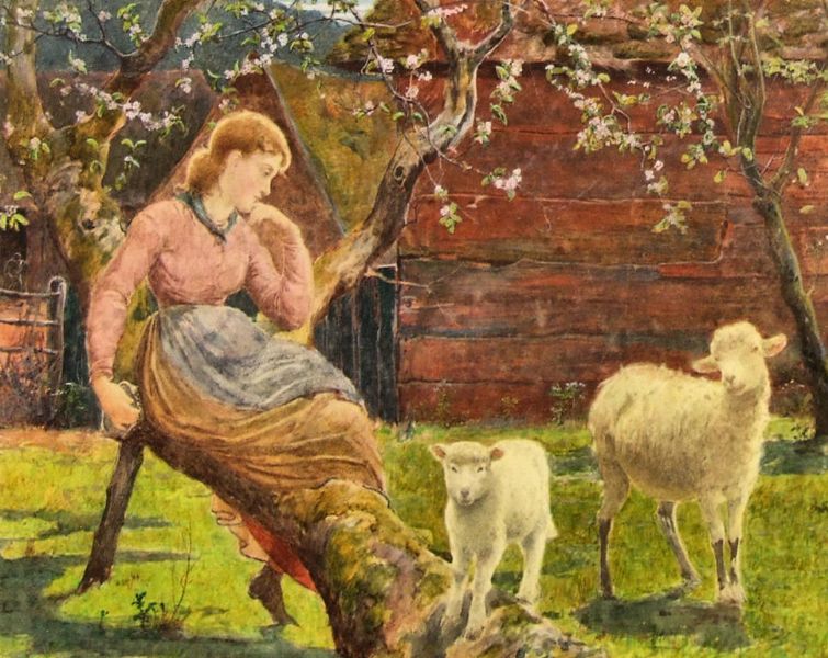 | Young woman seated on a tree in blossom with a sheep and lamb at her side, and farm buildings in the background | |