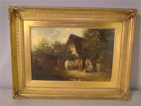 COUNTRY FOLK WITH HORSES OUTSIDE THEIR COTTAGE