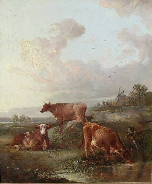 | East Anglian landscape with cattle to the fore, a windmill and cottage beyond | |