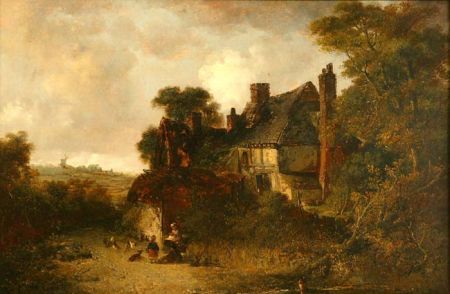 | Figures, Dog and Domestic Fowl in a Country Lane before a Cottage, Windmill in Distance | |