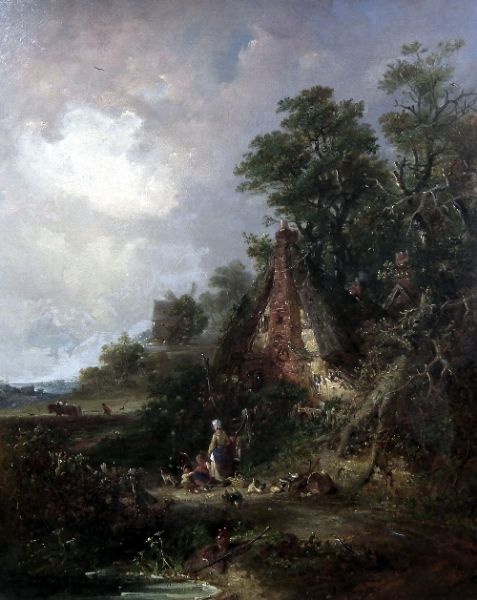 Rural landscape with young family outside a thatched cottage, with windmill to background