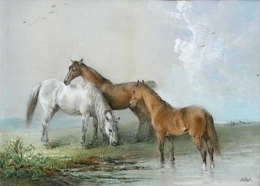 Study of a Grey, a Bay and a Chestnut Pony at Water