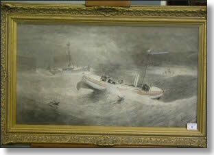 | The Lifeboat "Duke of Northumberland" in heavy seas attending a wreck and passing the Cork Light Ship | |