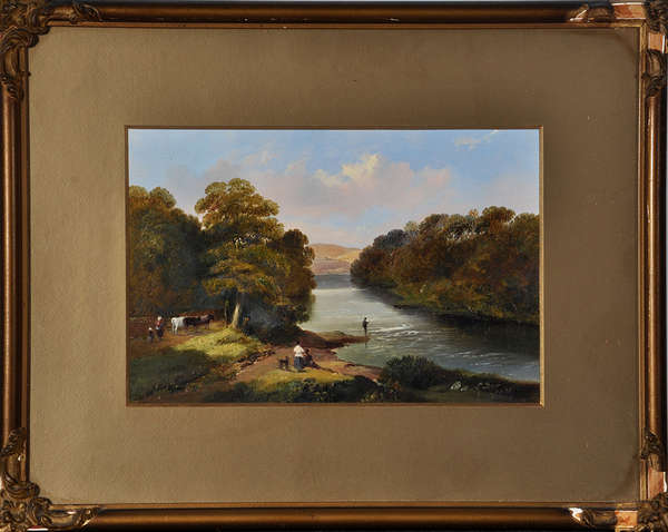 An angler and other figures at the bank of a river