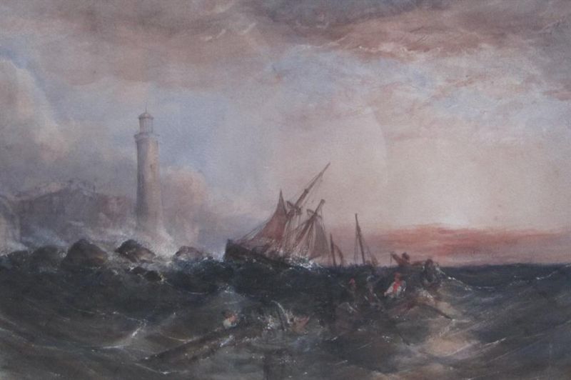 A Ship in distress off a Rocky Coast near a Lighthouse