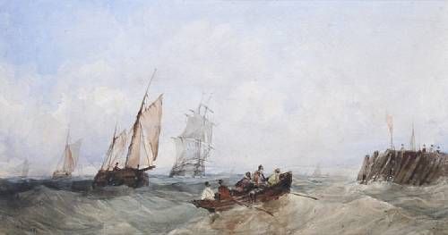 Fishermen in a rowing boat, before three fishing boats in a choppy sea