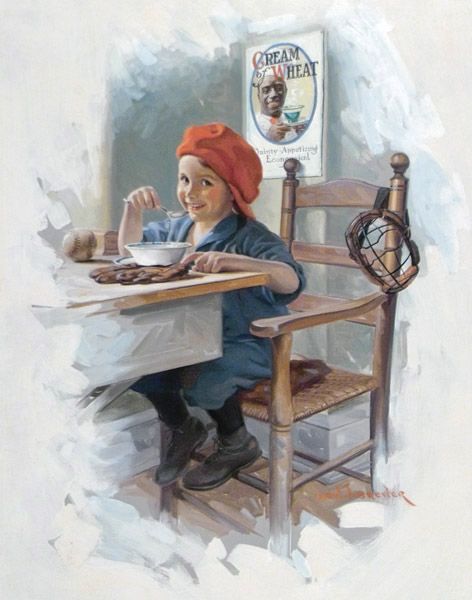 | Boy sitting at a table eating bowl of cereal; glove & baseball | |