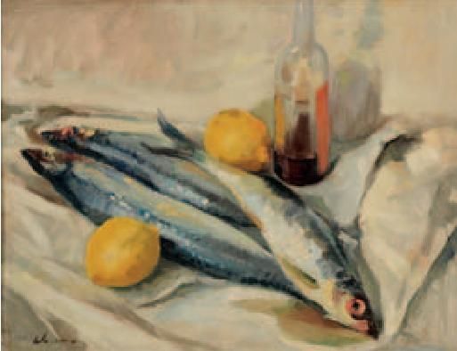 Still life of herrings, lemons and wine bottle on a table