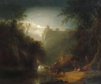 | Moonlit River Scene with Camp Fire, Castle in the Distance | |
