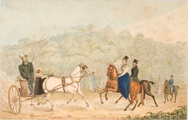 | An elegant gentleman in his carriage with his manservant is being approached by an equally elegant woman on horseback with her | |