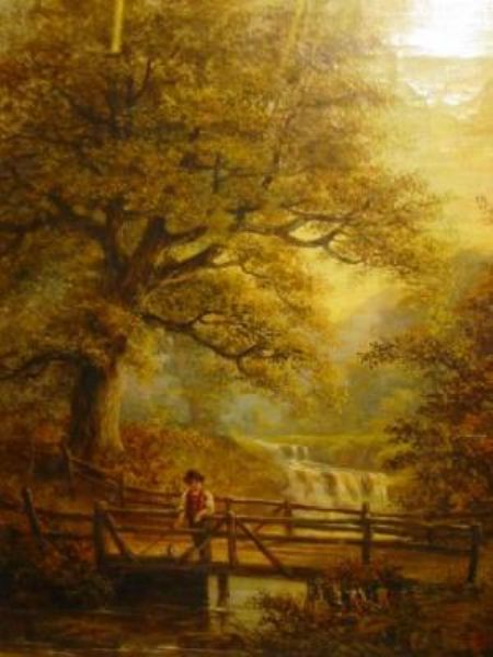 | Wooded River Scene with Boy Fishing from a Wooden Bridge | |