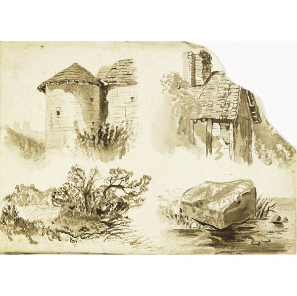 | Four works of art: Studies (architecture, foliage and a rock), ca. 1890 | |