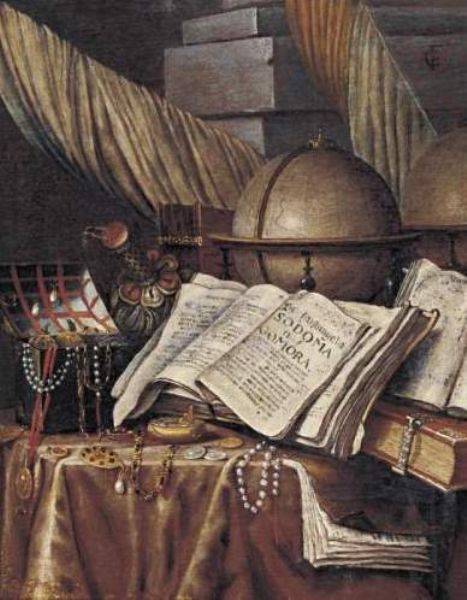 | VANITAS STILL LIFE WITH A GLOBE, BOOKS AND A BOX OF JEWELS ALL RESTING ON A DRAPED TABLE | |