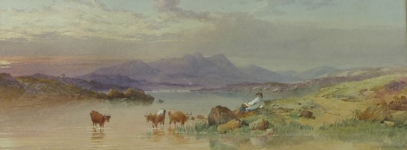 | Kyles of Bute, a Scottish landscape with figure and cattle to the fore and Highlands in the distance | |
