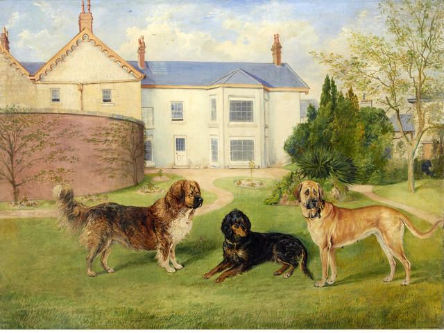 A Gordon Setter, a Mastiff and a St Bernard on the lawn before a country house