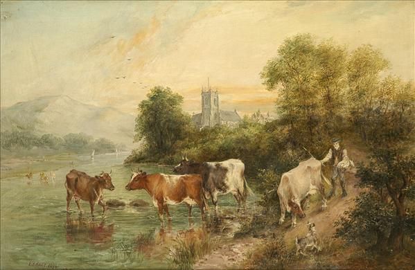 Evening, The Banks Of The Severn, with cattle, drover and dog