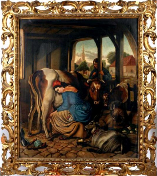 | Milking Time, - with farm animals and figure looking on, in attractive carved Florentine frame with scrolling leaves | |