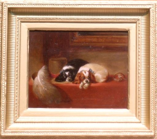 TWO KING CHARLES SPANIELS BESIDE A FEATHERED HAT