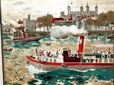 | depicting sailing boats and steam ships to the River Thames with the Tower of London to the distance | |