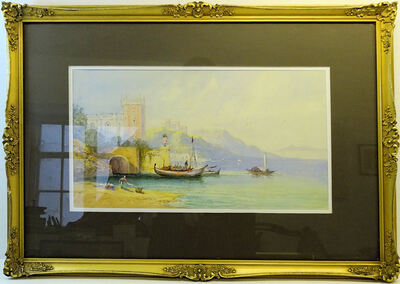 Continental lake landscape with fishing boats buildings etc