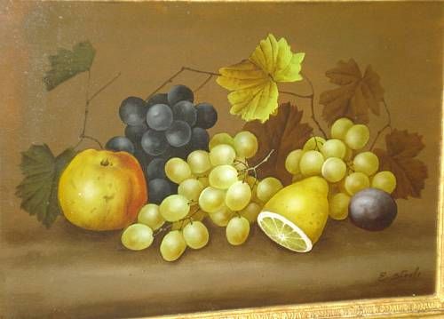 A pair of still life studies of apples, grapes, peaches and a sliced lemon