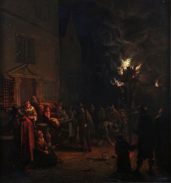 | A Nocturnal Village Scene on the Oude Delft, with Numerous Figures Gathered Around a Burning Tar-Barrel | |