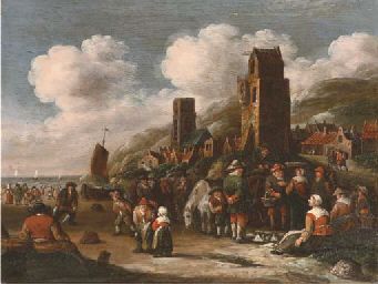 | Fisherfolk on a beach at Katwijk aan Zee with sailing vessels beyond | |