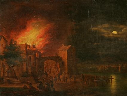 Paysage fluvial avec incendie nocturne