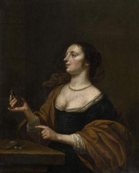 | Portrait of an elegant lady holding a mirror in her right hand. | |