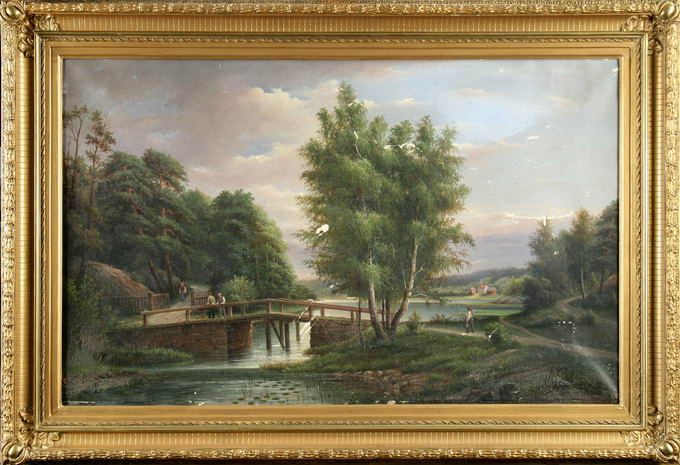 Landskap med bro och vattendrag